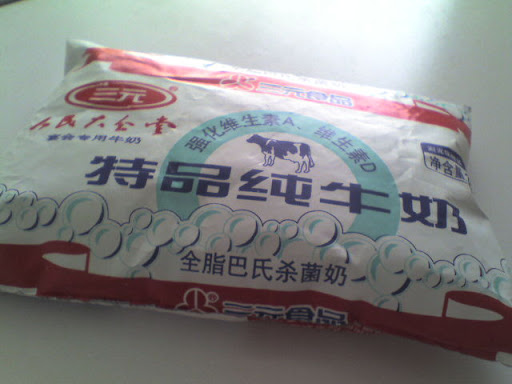 北京據說因為靠近蒙古草原,所以牛奶品質不錯。牛奶的確是很香,拿來泡我從台灣辛苦扛來的咖啡粉,好喝度加倍!!比較特別的是這裡的常溫奶比鮮奶更多,我來的時候要找鮮奶,大概都只能在架上的小角落找到。然而後來我在超市看到還有一種叫做”利樂枕”(真的就是像枕頭那樣的包裝)包裝的牛奶,保存期限就是兩到三天。聽起來就好像品質很好的樣子(應該是吧?!)。人家說除了這種之外,都叫垃圾奶。